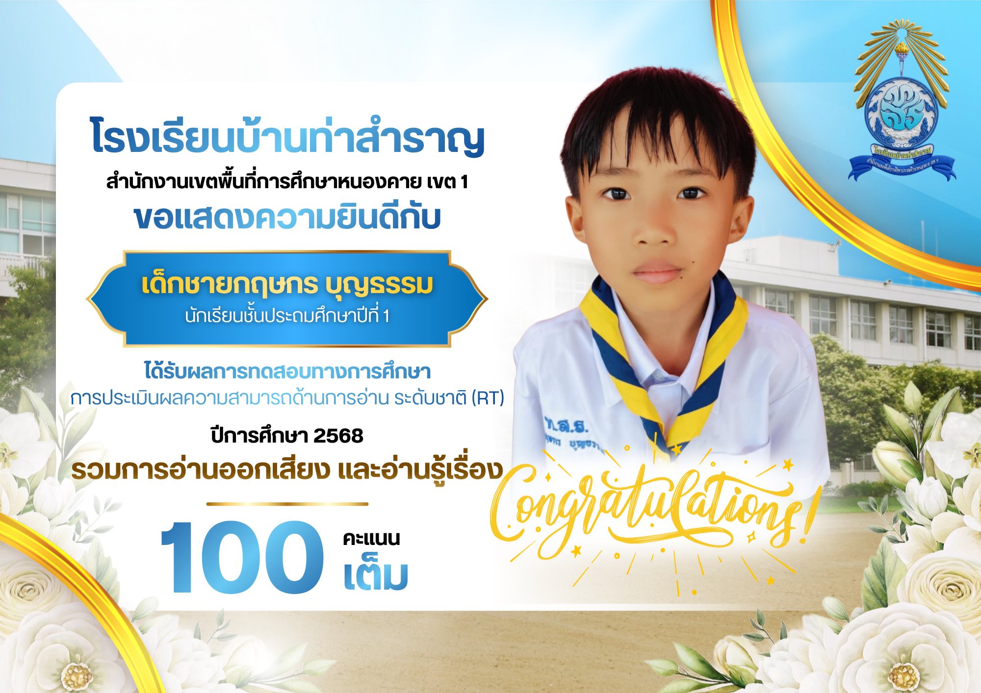 ขอแสดงความยินดีกับนักเรียนชั้น ป.1 ที่มีผลการทดสอบ RT ปีการศึกษา 2568 เต็ม 100 คะแนน